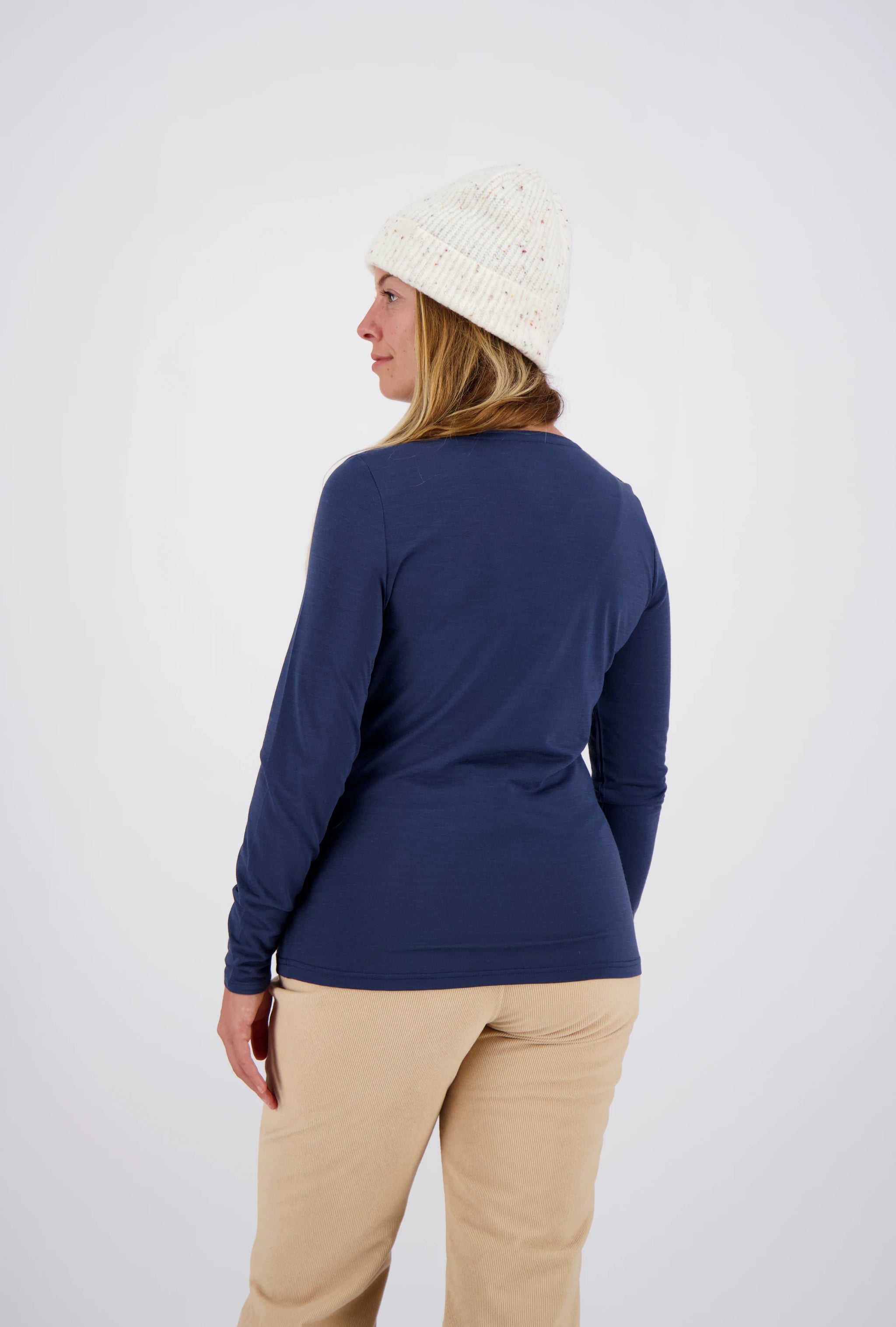 This long-sleeved shirt was designed for maximum performance in changing conditions – ideal for outdoor activities, travel, and everyday wear. The fabric blend with 47% merino wool offers natural climate comfort combined with technical performance. The merino wool actively regulates your body temperature: it cools you when it's warm, warms you when it's cold, and keeps you pleasantly dry and odor-free, even during multi-day activities. The feminine cut with a crew neck, the lightweight feel, and the stretchy fabric make this long-sleeved shirt a versatile all-rounder – whether worn as a baselayer or on its own.